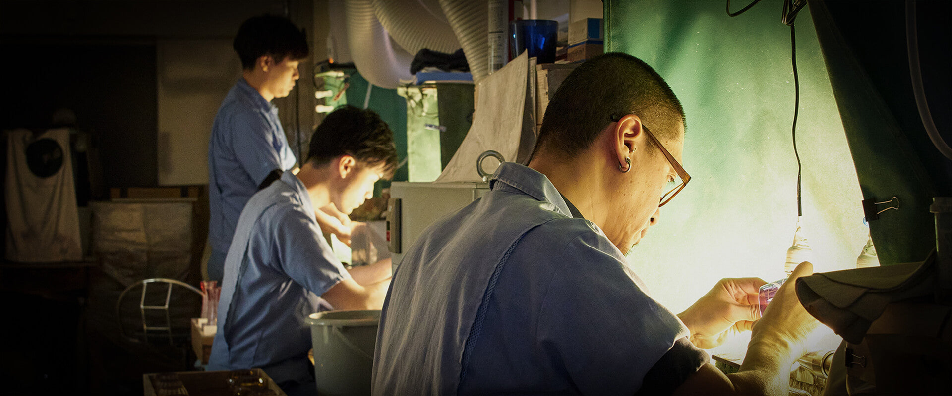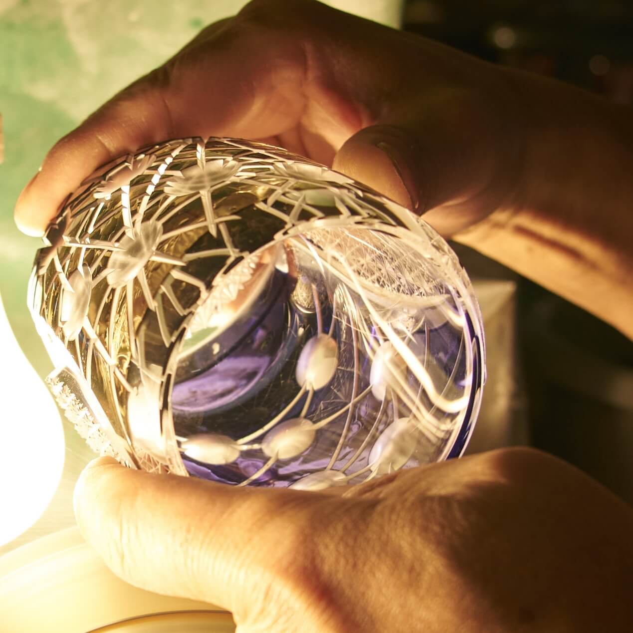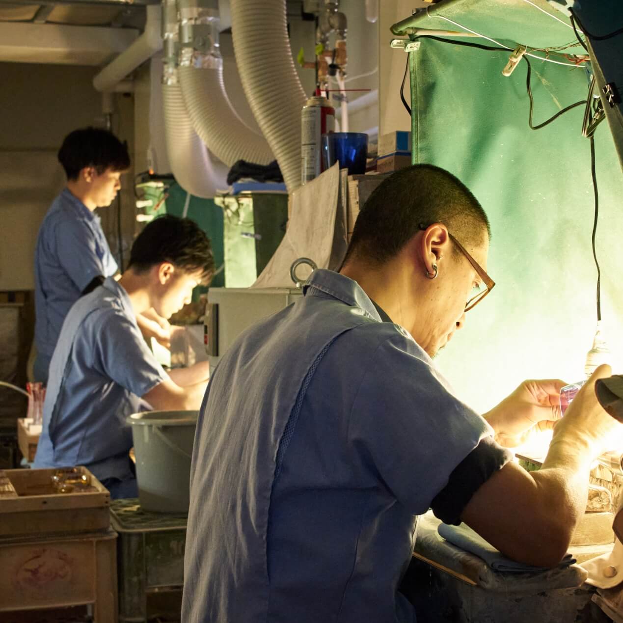 まったく新しい江戸切子の姿を生み出した3代目鍋谷淳一。そしてそのデザインをさらに進化させている4代目鍋谷海斗。この2人に共通するこだわりは「素材」と「技術」です。圧倒的な高品質と希少性を持つ日本最高峰のクリスタルを素材として使用します。また、見た瞬間に心惹かれ、手にした瞬間に心躍り、唇に触れた瞬間に心満たされる、そんなグラスを生み出すため、技術を日々徹底的に磨き上げています。